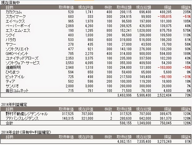 利益確定分も含めると2014年の年初来パフォーマンスは+5.0%(+327万円)でした。